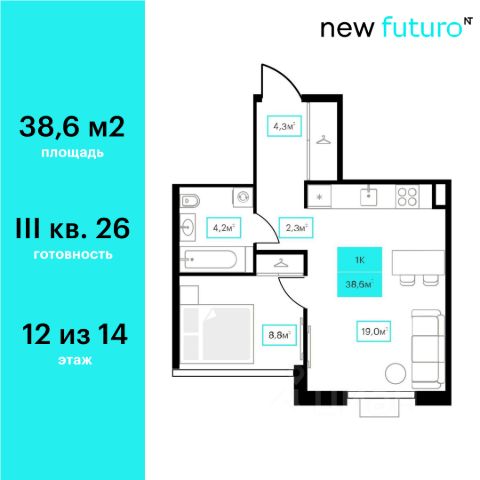 Продаётся 1-комнатная квартира в строящемся доме (Дом 6к2), срок сдачи: III-кв. 2026, общей площадью 38.6 кв.м., на 12 этаже. Новый жилой комплекс "Futuro" от застройщика "newton" расположен в г. Тюмень на Ставропольской улице.