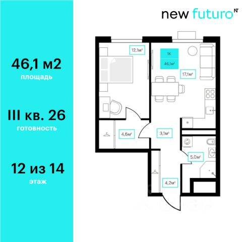 Продаётся 1-комнатная квартира в строящемся доме (Дом 6к2), срок сдачи: III-кв. 2026, общей площадью 46.1 кв.м., на 12 этаже. Новый жилой комплекс "Futuro" от застройщика "newton" расположен в г. Тюмень на Ставропольской улице.