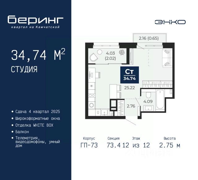 Просторная 3-комн. квартира в ЖК "Беринг" на 12 этаже. Квартира без отделки, новый владелец может сделать ремонт по индивидуальному дизайн-проекту. Общая площадь: 74.63 кв.м., жилая: 34.75 кв.м., площадь просторной кухни-столовой: 16.25 кв.м. Комнаты изолированные, все окна выходят на одну сторону. В квартире одна лоджия, два совмещенных санузла. Высота потолков 2.75 м. Дом монолитный, многоподъездный, переменной этажности, от 9 до 21 этажей. Квартира находится в 4-й секции высотой 14 этажей в корпусе ГП-74. На этаже 7 квартир. В подъезде 1 пассажирский и 1 грузовой лифт. Окончание строительства - 4 квартал 2025 года. Оформление сделки по договору долевого участия. Подобно знаменитому исследователю, мы чувствуем себя первооткрывателями этой локации. Хотим показать новую суть места, сформировать для вас жизненный опыт, которого ещё не было. Беринг — район зелёного цвета. Беринг — район, который откроется вам с другой стороны. Впечатлит новым уровнем комфорта и качеством жизни. Беринг — открытие на карте города. Первый квартал расположен в районе Тура, в границах улиц: Камчатская Западносибирская Энтузиастов. Вокруг уже есть всё для того, чтобы ежедневная рутина была лишь частью жизни и не доставляла дискомфорта. Школы и детские сады, магазины и аптеки, поликлиника, места для семейного отдыха, пеших и велопрогулок, и даже рыбалки. Масштабное озеленение дворов — визитная карточка ЭНКО и ваш оазис спокойствия, чтобы отвлечься от повседневности. Раскидистые деревья, кустарники, травы и цветы — осталось остановиться, вдохнуть и расслабиться, глядя на эту природную красоту. Стилистика подъездов продолжает концепцию Беринга, вдохновлённого Камчаткой: сдержанный, но при этом впечатляющий дизайн соседствует с удобством и функциональностью. #zUsBSA