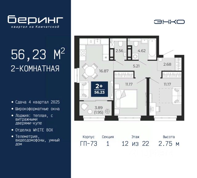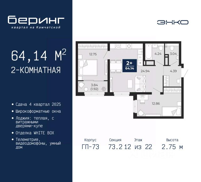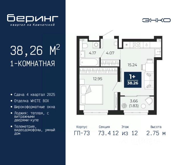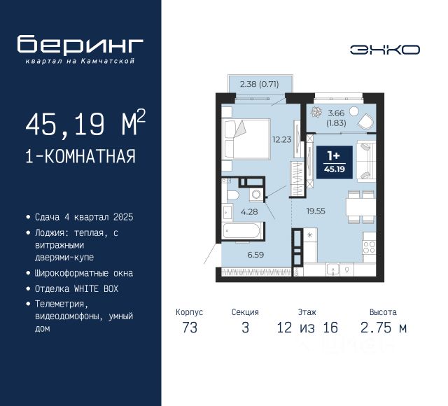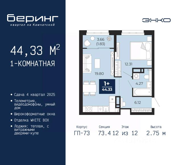 Продается трехкомнатная квартира от застройщика в ЖК "Беринг" на 12 этаже. Квартира без отделки, полностью готова к чистовой отделке и дальнейшему ремонту. Общая площадь: 74.63 кв.м., жилая: 34.75 кв.м., площадь просторной кухни-столовой: 16.25 кв.м. Комнаты изолированные, все окна выходят на одну сторону. В квартире одна лоджия, два совмещенных санузла. Высота потолков 2.75 м. Дом монолитный, многоподъездный, переменной этажности, от 9 до 21 этажей. Квартира находится в 4-й секции высотой 14 этажей в корпусе ГП-74. На этаже 7 квартир. В подъезде 1 пассажирский и 1 грузовой лифт. Окончание строительства - 4 квартал 2025 года. Оформление сделки по договору долевого участия. Подобно знаменитому исследователю, мы чувствуем себя первооткрывателями этой локации. Хотим показать новую суть места, сформировать для вас жизненный опыт, которого ещё не было. Беринг — район зелёного цвета. Беринг — район, который откроется вам с другой стороны. Впечатлит новым уровнем комфорта и качеством жизни. Беринг — открытие на карте города. Первый квартал расположен в районе Тура, в границах улиц: Камчатская Западносибирская Энтузиастов. Вокруг уже есть всё для того, чтобы ежедневная рутина была лишь частью жизни и не доставляла дискомфорта. Школы и детские сады, магазины и аптеки, поликлиника, места для семейного отдыха, пеших и велопрогулок, и даже рыбалки. Масштабное озеленение дворов — визитная карточка ЭНКО и ваш оазис спокойствия, чтобы отвлечься от повседневности. Раскидистые деревья, кустарники, травы и цветы — осталось остановиться, вдохнуть и расслабиться, глядя на эту природную красоту. Стилистика подъездов продолжает концепцию Беринга, вдохновлённого Камчаткой: сдержанный, но при этом впечатляющий дизайн соседствует с удобством и функциональностью. #Zu5BsA