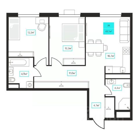 Квартира с кухней-гостиной и двумя спальнями в квартале "На Гастелло". Особенности планировки: окна на две стороны, второй санузел, окна в пол, вид во двор, разнесённые спальни, предчистовая отделка, терраса, балкон.