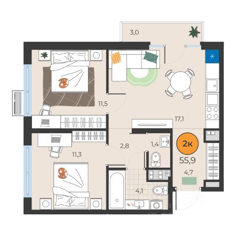Продается 2-комн. квартира от застройщика с предчистовой отделкой в ЖК "Прео" на 10 этаже. Общая площадь: 56.08 кв.м., жилая: 22.33 кв.м., площадь просторной кухни-столовой: 16.04 кв.м. Комнаты изолированные, все окна выходят на одну сторону. В квартире один раздельный санузел. Высота потолков 2.7 м.