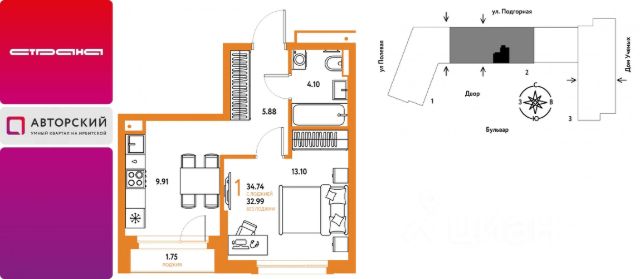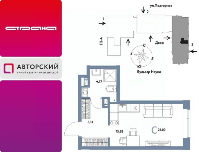 Новая квартира в ЖК "Авторский" напрямую от федерального застройщика "Страна Девелопмент". Продается 2комнатная квартира на 12 этаже от застройщика Страна Девелопмент. Площадь квартиры 40,77 кв. м. Жилой комплекс "Авторский" — квартал для авторов своей жизни от федерального застройщика "Страна Девелопмент" вблизи исторического центра — до Моста Влюблённых 4 минуты на авто, а ещё рядом ведущие вузы Тюмени. ПРЕИМУЩЕСТВА - Тематический бульвар объединяет дома и закрытые дворы квартала в единую экосистему: зелень, перголы для отдыха, детские и спортивные площадки. По вечерам бульвар преображается: освещение создаёт уютную атмосферу. - Новый детский сад рядом, который появится в 2026 году прямо в одном из корпусов комплекса. В нём выделено 150 мест для малышей. - Во дворах нет машин, шума, выхлопных газов и посторонних людей. Всё пространство разделено на зоны по интересам и возрастам. Для детей — игровые площадки из эко-материалов и мягкая защита от падений. Для взрослых — зоны отдыха, воркаут-площадки и тропинки для неспешных прогулок. ОТДЕЛКА Квартиры сдаются с предчистовой отделкой: произведена разводка электричества и отопления, выполнена стяжка пола, стены выровнены "под маяк", установлены розетки, выключатели и радиаторы. ДИЗАЙНЕРСКАЯ ОТДЕЛКА При покупке квартиры в ЖК "Авторский" можно включить стоимость ремонта в ипотеку. Пять вариантов на выбор: хлопковая нить, серый шторм, белый камень, шалфей, голубой вереск. СПОСОБЫ ПОКУПКИ Сотрудники "Страна Девелопмент" будут сопровождать вас на каждом этапе сделки, помогут получить одобрение по ипотеке или снизить ежемесячный платеж. - ипотека - рассрочка - с использованием материнского капитала -100% оплата наличными Цены на квартиры указаны без учета скидок. На консультации менеджер подскажет, какие акции действуют, и как получить одобрение по ипотеке с низкой ставкой.