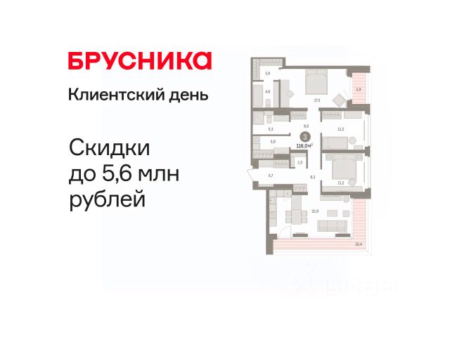 3-комн. квартира с предчистовой отделкой в Кварталы "На Минской" на 13 этаже. Общая площадь: 116 кв.м., жилая: 39.7 кв.м., площадь просторной кухни-гостиной: 22.9 кв.м. Квартира угловая, очень светлая, естественная вентиляция при открытии окон. В квартире один балкон и одна лоджия, два совмещенных санузла. Терраса представляет собой роскошную зону отдыха, где вы на свой вкус можете создать атмосферу комфорта и уюта. Высота потолков 2.7 м. Дом монолитный, многоподъездный, переменной этажности, от 7 до 16 этажей. Квартира находится в 1-й секции высотой 16 этажей в корпусе 1. На этаже 8 квартир. В подъезде 2 пассажирских лифта. Окончание строительства - 4 квартал 2026 года. Оформление сделки по договору долевого участия. Квартира с кухней-гостиной и тремя спальнями в кварталах "На Минской". Особенности планировки: гардеробная, лоджия, мастер-спальня, панорамное остекление, постирочная, предчистовая отделка. квартиры в нашей базе: МНС01-Ж1.13.1. В сердце города Кварталы "На Минской" находятся в самом центре. За десять минут можно дойти до площади 400-летия Тюмени и Большого Драматического театра, Тюменского индустриального и медицинского университетов, спортивного комплекса "Строймаш", ТРЦ "Гудвин" и "Премьер", Тюменского технопарка. Поблизости много детских садов, школ и поликлиник. Пространство разного опыта Создавая кварталы "На Минской" мы вдохновлялись Хакскими дворами в Берлине и улицей Давида Агмашенебели в Тбилиси. И первые и вторая — яркие разнообразные пространства, сформированные прогрессивными архитекторами и притягивающие городских интеллектуалов. Престижная недвижимость здесь соседствует с барами, ресторанами, креативными кластерами и бюро, дизайнерскими лавками. Полезные улицы Кварталы "На Минской" свяжет сеть променадов, автомобильных проездов и велодорожек. Уличный фронт проекта мы сформируем с помощью аллейной посадки деревьев. Они создадут тень для ресторанов и кафе на первых этажах, визуально отделят проезжую и пешеходную части, снизят объём пыли и уровень шума. Мы реализуем проект в районе с развитой базовой инфраструктурой. И поэтому тщательно подошли к программированию коммерции, посчитав, что её основная задача — "закрывать" более высокие потребности жителей. Здесь может появиться пекарня с вкусными круассанами, турагентство на случай, если захочется перезимовать в Сочи, массажный кабинет, ресторан, когда надоело есть дома и многое другое. #zwTEmV