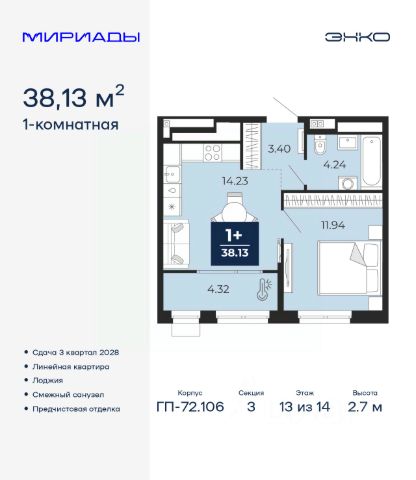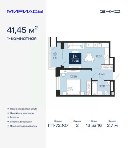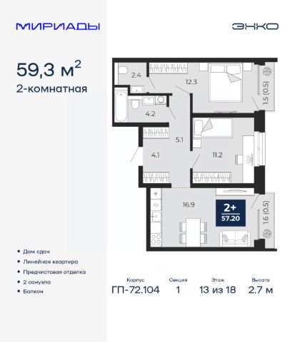 Спешите забронировать по акционной цене, предложение ограничено! Стоимость квартиры указана со скидкой, ваша экономия составит 822,021 руб. Информация по телефону, наши менеджеры вам все расскажут. Просторная двухкомнатная квартира с предчистовой отделкой в ЖК "Мириады" на 13 этаже. Общая площадь: 59.3 кв.м., жилая: 23.5 кв.м., площадь просторной кухни-столовой: 16.9 кв.м. Комнаты изолированные, все окна выходят на одну сторону. В квартире два балкона, один совмещенный и один раздельный санузел. Высота потолков 2.7 м. Дом монолитный, двухподъездный, переменной этажности, от 14 до 18 этажей. Квартира находится в 1-й секции высотой 18 этажей в корпусе ГП-72.104. На этаже 6 квартир. В подъезде 1 пассажирский и 1 грузовой лифт. Строительство окончено, дом сдан в 4 квартале 2025 года. Оформление сделки по договору купли-продажи. Вселенная бесконечных историй. Ранее невиданный Тюмени масштаб: территория 240 гектаров и 1 650 000 м² застройки. Мириады это город масштабных перемен и больших возможностей. Город зеленых рощ и зеркальных озер. Город для работы, учебы и развлечений. Город для детей и их родителей. Город для всех и каждого. Проект расположен в районе Мыс рядом с ТРЦ "Тюмень Сити Молл" в границах улицы Тимофея Чаркова, Тобольского тракта и объездной дороги. Срок полного освоения территории - до 2034 года. #zmDFDF