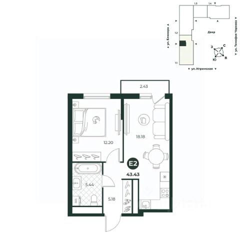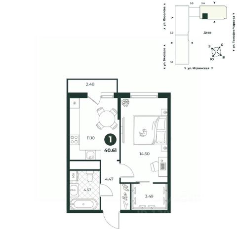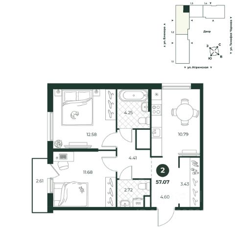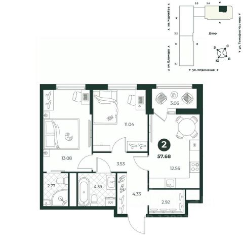 Евродвухкомнатная квартира с выходом на балкон из спальни. Просторная кухня-гостиная - идеальное пространство для комфортной жизни и времяпрепровождения с близкими. Из комнаты можно выйти на балкон. В прихожей есть ниша под шкаф. Санузел совмещенный, его площадь позволяет установить стиральную машину.