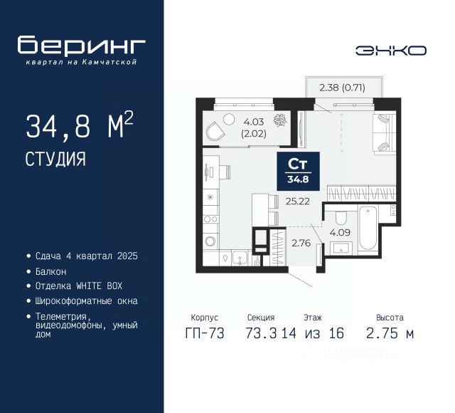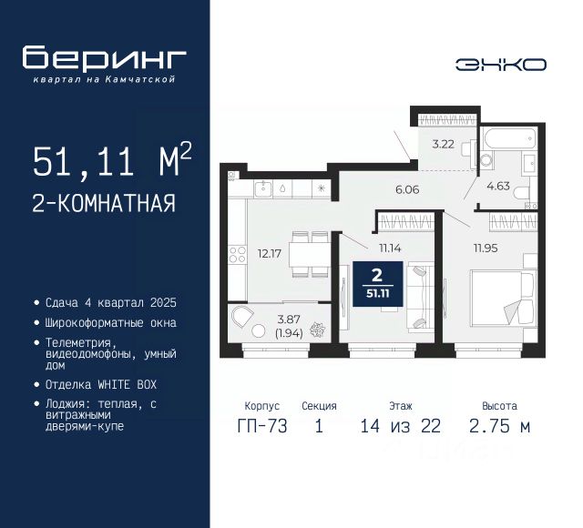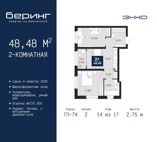 Продается двухкомнатная квартира в ЖК "Беринг" на 14 этаже. Квартира без отделки, после оформления собственности можно делать ремонт. Общая площадь: 48.48 кв.м., жилая: 22.47 кв.м., площадь просторной кухни-столовой: 11.67 кв.м. Угловая квартира, очень светлая, естественная вентиляция при открытии окон. В квартире одна лоджия, один совмещенный санузел. Высота потолков 2.75 м. Дом монолитный, многоподъездный, переменной этажности, от 9 до 21 этажей. Квартира находится во 2-й секции высотой 17 этажей в корпусе ГП-74. На этаже 7 квартир. В подъезде 1 пассажирский и 1 грузовой лифт. Окончание строительства - 4 квартал 2025 года. Оформление сделки по договору долевого участия. Подобно знаменитому исследователю, мы чувствуем себя первооткрывателями этой локации. Хотим показать новую суть места, сформировать для вас жизненный опыт, которого ещё не было. Беринг — район зелёного цвета. Беринг — район, который откроется вам с другой стороны. Впечатлит новым уровнем комфорта и качеством жизни. Беринг — открытие на карте города. Первый квартал расположен в районе Тура, в границах улиц: Камчатская Западносибирская Энтузиастов. Вокруг уже есть всё для того, чтобы ежедневная рутина была лишь частью жизни и не доставляла дискомфорта. Школы и детские сады, магазины и аптеки, поликлиника, места для семейного отдыха, пеших и велопрогулок, и даже рыбалки. Масштабное озеленение дворов — визитная карточка ЭНКО и ваш оазис спокойствия, чтобы отвлечься от повседневности. Раскидистые деревья, кустарники, травы и цветы — осталось остановиться, вдохнуть и расслабиться, глядя на эту природную красоту. Стилистика подъездов продолжает концепцию Беринга, вдохновлённого Камчаткой: сдержанный, но при этом впечатляющий дизайн соседствует с удобством и функциональностью. #zU56Mm