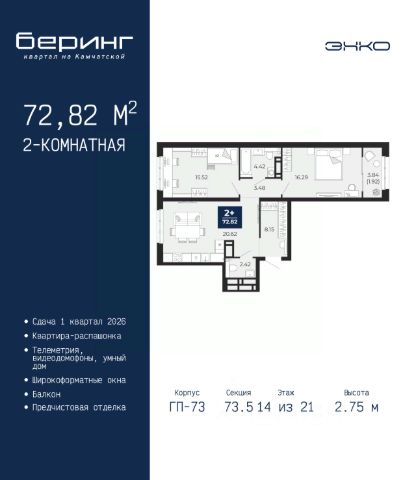 Однокомнатная квартира от застройщика с предчистовой отделкой в ЖК "Беринг" на 14 этаже. Общая площадь: 37.83 кв.м., жилая: 12.19 кв.м., площадь просторной кухни-столовой: 15.13 кв.м. Все окна выходят на одну сторону. В квартире одна лоджия, один совмещенный санузел. Высота потолков 2.75 м. Дом монолитный, многоподъездный, переменной этажности, от 9 до 21 этажей. Квартира находится в 4-й секции высотой 14 этажей в корпусе ГП-74. На этаже 7 квартир. В подъезде 1 пассажирский и 1 грузовой лифт. Окончание строительства - 1 квартал 2026 года. Оформление сделки по договору долевого участия. Подобно знаменитому исследователю, мы чувствуем себя первооткрывателями этой локации. Хотим показать новую суть места, сформировать для вас жизненный опыт, которого ещё не было. Беринг — район зелёного цвета. Беринг — район, который откроется вам с другой стороны. Впечатлит новым уровнем комфорта и качеством жизни. Беринг — открытие на карте города. Первый квартал расположен в районе Тура, в границах улиц: Камчатская Западносибирская Энтузиастов. Вокруг уже есть всё для того, чтобы ежедневная рутина была лишь частью жизни и не доставляла дискомфорта. Школы и детские сады, магазины и аптеки, поликлиника, места для семейного отдыха, пеших и велопрогулок, и даже рыбалки. Масштабное озеленение дворов — визитная карточка ЭНКО и ваш оазис спокойствия, чтобы отвлечься от повседневности. Раскидистые деревья, кустарники, травы и цветы — осталось остановиться, вдохнуть и расслабиться, глядя на эту природную красоту. Стилистика подъездов продолжает концепцию Беринга, вдохновлённого Камчаткой: сдержанный, но при этом впечатляющий дизайн соседствует с удобством и функциональностью. #z3sM0s