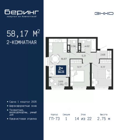 Успейте забронировать по этой цене, период предложения ограничен! Стоимость квартиры указана со скидкой, ваша экономия составит 417,117 руб. Звоните, наши менеджеры вам все расскажут. Двухкомнатная квартира с предчистовой отделкой в ЖК "Беринг" на 14 этаже. Общая площадь: 58.17 кв.м. Высота потолков 2.75 м. Дом монолитный, многоподъездный, переменной этажности, от 9 до 22 этажей. Квартира находится в 1-й секции высотой 22 этажа в корпусе ГП-73. На этаже 5 квартир. В подъезде 1 пассажирский и 1 грузовой лифт. Окончание строительства - 1 квартал 2026 года. Оформление сделки по договору долевого участия. Подобно знаменитому исследователю, мы чувствуем себя первооткрывателями этой локации. Хотим показать новую суть места, сформировать для вас жизненный опыт, которого ещё не было. Беринг — район зелёного цвета. Беринг — район, который откроется вам с другой стороны. Впечатлит новым уровнем комфорта и качеством жизни. Беринг — открытие на карте города. Первый квартал расположен в районе Тура, в границах улиц: Камчатская Западносибирская Энтузиастов. Вокруг уже есть всё для того, чтобы ежедневная рутина была лишь частью жизни и не доставляла дискомфорта. Школы и детские сады, магазины и аптеки, поликлиника, места для семейного отдыха, пеших и велопрогулок, и даже рыбалки. Масштабное озеленение дворов — визитная карточка ЭНКО и ваш оазис спокойствия, чтобы отвлечься от повседневности. Раскидистые деревья, кустарники, травы и цветы — осталось остановиться, вдохнуть и расслабиться, глядя на эту природную красоту. Стилистика подъездов продолжает концепцию Беринга, вдохновлённого Камчаткой: сдержанный, но при этом впечатляющий дизайн соседствует с удобством и функциональностью. #26Dffd
