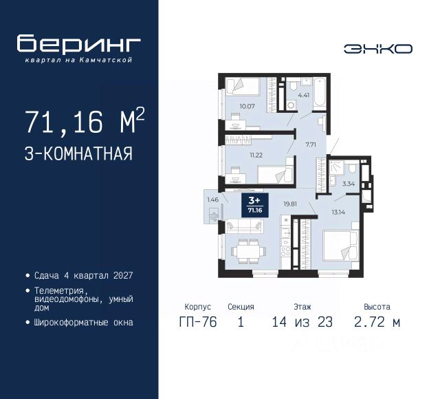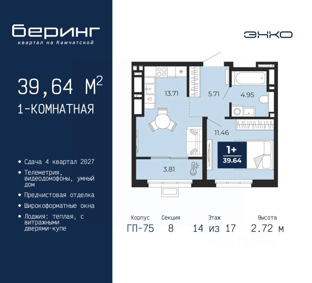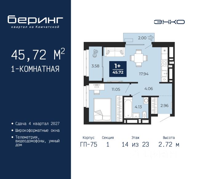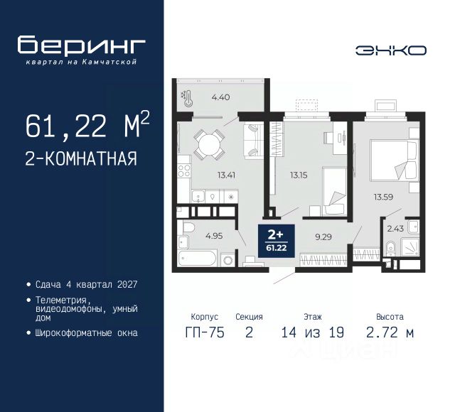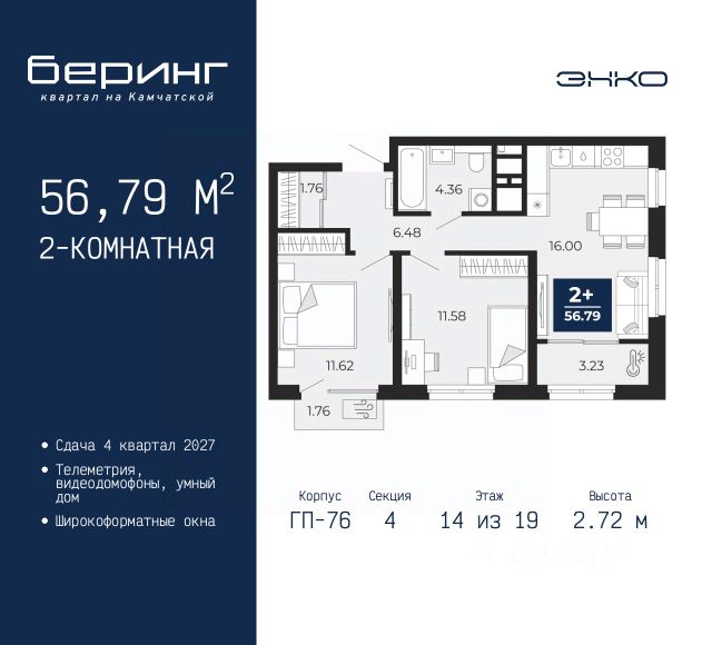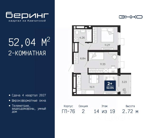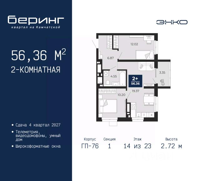 Продается 2-комн. квартира в ЖК "Беринг" на 14 этаже. Общая площадь: 57.63 кв.м. Высота потолков 2.72 м. Дом монолитный, многоподъездный, переменной этажности, от 17 до 24 этажей. Квартира находится во 2-й секции высотой 19 этажей в корпусе ГП-75. На этаже 7 квартир. В подъезде 2 пассажирских и 1 грузовой лифт. Окончание строительства - 4 квартал 2027 года. Оформление сделки по договору долевого участия. Подобно знаменитому исследователю, мы чувствуем себя первооткрывателями этой локации. Хотим показать новую суть места, сформировать для вас жизненный опыт, которого ещё не было. Беринг — район зелёного цвета. Беринг — район, который откроется вам с другой стороны. Впечатлит новым уровнем комфорта и качеством жизни. Беринг — открытие на карте города. Первый квартал расположен в районе Тура, в границах улиц: Камчатская Западносибирская Энтузиастов. Вокруг уже есть всё для того, чтобы ежедневная рутина была лишь частью жизни и не доставляла дискомфорта. Школы и детские сады, магазины и аптеки, поликлиника, места для семейного отдыха, пеших и велопрогулок, и даже рыбалки. Масштабное озеленение дворов — визитная карточка ЭНКО и ваш оазис спокойствия, чтобы отвлечься от повседневности. Раскидистые деревья, кустарники, травы и цветы — осталось остановиться, вдохнуть и расслабиться, глядя на эту природную красоту. Стилистика подъездов продолжает концепцию Беринга, вдохновлённого Камчаткой: сдержанный, но при этом впечатляющий дизайн соседствует с удобством и функциональностью. #ZToz6t