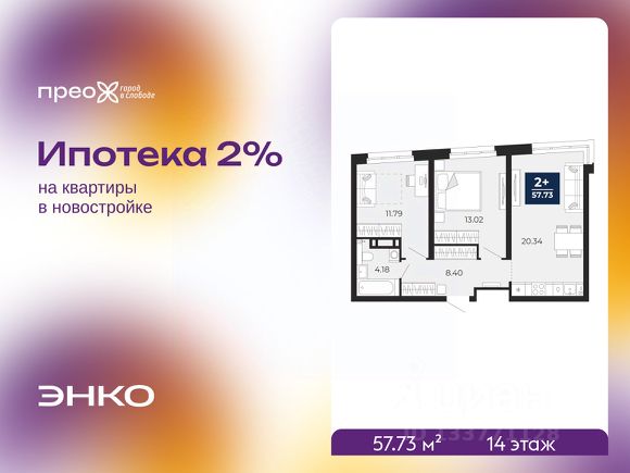 Успейте забронировать по этой цене, предложение ограничено! Стоимость квартиры указана со скидкой, ваша экономия составит 1,358,500 руб. Звоните, наши менеджеры вам все расскажут. Двухкомнатная квартира с предчистовой отделкой в ЖК "Прео" на 14 этаже. Общая площадь: 57.73 кв.м., жилая: 24.81 кв.м., площадь просторной кухни-столовой: 20.34 кв.м. Комнаты изолированные, все окна выходят на одну сторону. В квартире один совмещенный санузел. Высота потолков 2.7 м. Дом монолитный, трехподъездный, переменной этажности, от 14 до 23 этажей. Квартира находится в 1-й секции высотой 23 этажа в корпусе 206. На этаже 8 квартир. В подъезде 1 пассажирский и 1 грузовой лифт. На сегодняшний день строительство окончено, дом сдан в 1 квартале 2026 года. Оформление сделки по договору купли-продажи. Преображенский — один из самых привлекательных районов для жизни! Это полностью самостоятельный жилой район с точки зрения инфраструктуры. Преображенский находится между Московским и Червишевским трактами в квартале улиц Закалужская — Вьюжная — Александра Протозанова. Не нужно ждать, когда появится инфраструктура — переезжайте на всё готовое. Вблизи расположены действующие школа и детский сад. В этом году откроется еще один сад, а в следующем году — школа. По соседству с Преображенским запланировано строительство городского парка "Комарово" площадью 38 гектар. За 10 минут можно доехать на автомобиле до крупных ТРЦ: "Лента", "Кристалл", "Леруа Мерлен", "Метро" и "Ашан". С 2018 года в районе открыт Соседский центр — пространство, созданное для формирования добрососедской среды, совместного досуга, общения и реализации соседских инициатив. Здесь проходят встречи соседей, а также сами жители района организовывают мероприятия. Организатором такого события может стать любой желающий. В квартирах выполнена качественная предчистовая отделка. Гладкие стены с финишным выравниванием по маякам. Ровный потолок для установки натяжного потолка. Установлены пятикамерные окна с двойным стеклопакетом (3 стекла). Дизайнерские холлы с видеонаблюдением, безбарьерным и прозрачным входом всегда светло и спокойно. На первом этаже есть просторные колясочные, где все жители могут оставлять свои коляски и велосипеды. В Преображенском есть всё, что нужно для активного отдыха и занятий спортом. Мы сделали большое футбольное поле с безопасным покрытием. Также установили хоккейный корт, который оборудован по всем необходимым стандартам. Во дворах можно делать упражнения на специальных площадках с турниками. Весь район мы обустроили велодорожками, которые связаны в единый маршрут. У нас есть сухие фонтаны, бьющие из земли, деревья, веревки, сетки, скалодром, газон, песок и резинка — осталось просто дать своему ребенку право на свободную игру. По-настоящему хорошие дворы — это те, которые дети предпочитают соцсетям и телевизору. Аккредитация в банках: ПАО Банк "ВТБ", "Сбербанк России", ПАО "Газпромбанк", ОАО "Альфа-Банк", ПАО "Банк Уралсиб" и других.