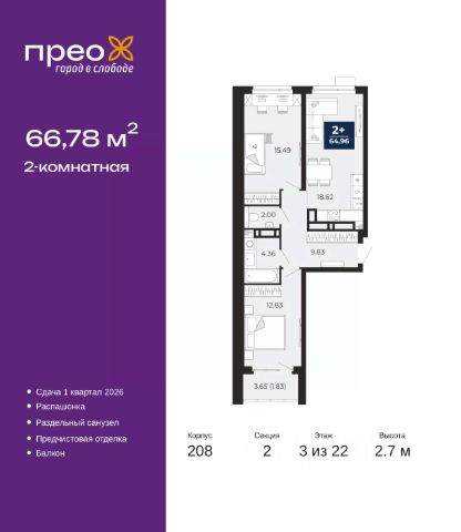 Трехкомнатная квартира от застройщика с предчистовой отделкой в ЖК "Прео" на 8 этаже. Общая площадь: 75.58 кв.м., жилая: 37.88 кв.м., площадь просторной кухни-столовой: 18.38 кв.м. Комнаты изолированные, все окна выходят на одну сторону. В квартире один балкон, один совмещенный санузел. Высота потолков 2.7 м.
