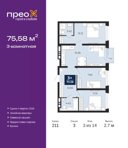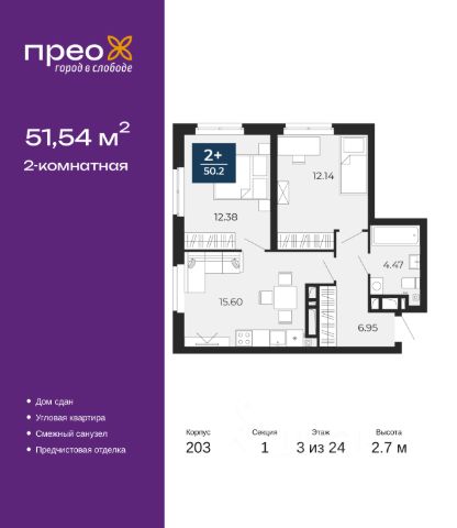 2-комн. квартира с предчистовой отделкой в ЖК "Прео" на 3 этаже. Общая площадь: 51.54 кв.м., жилая: 24.52 кв.м., площадь просторной кухни-столовой: 15.6 кв.м. Угловая квартира, очень светлая, естественная вентиляция при открытии окон. В квартире один совмещенный санузел. Высота потолков 2.7 м.
