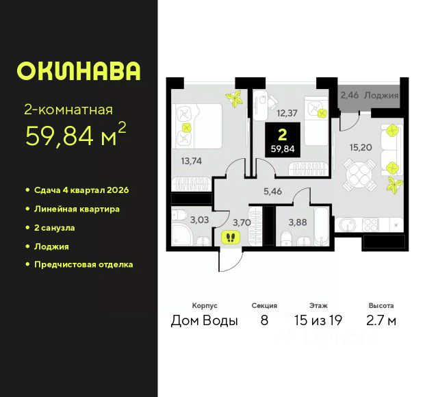 Продается двухкомнатная квартира с предчистовой отделкой в ЖК "Окинава" на 15 этаже. Общая площадь: 69 кв.м., жилая: 26.77 кв.м., площадь просторной кухни-столовой: 16.03 кв.м. Квартира - распашонка, без проходных комнат, окна выходят на paзные стороны дома. В квартире две лоджии, два совмещенных санузла. Высота потолков 2.7 м. Квартира будет сдана с предчистовой отделкой: на полах стяжка под финишное покрытие, стены подготовлены под покраску или оклейку обоями, разведена вся электрика с подготовкой для установки выключателей и освещения. При желании вы можете заказать отделку под ключ, варианты возможных решений представлены в альбоме фотографий. Дом монолитный, многоподъездный, переменной этажности, от 13 до 19 этажей. Квартира находится в 6-й секции высотой 19 этажей в корпусе Дом Огня. На этаже 12 квартир. В подъезде 2 пассажирских и 1 грузовой лифт. Окончание строительства - 3 квартал 2027 года. Оформление сделки по договору долевого участия. ЖК "Окинава" это не просто жилой комплекс, это остров 4 стихий. Они отражаются во внешнем виде фасадов домов, обустройстве дворов и внутреннем оформлении холлов. Каждая из стихий это отдельный дом. Между домами раскинется большой двухуровневый пешеходный бульвар. Первый уровень прогулочный с местами для отдыха, амфитеатром и фонтанами. На втором уровне расположатся площадки для детей, спортивных игр и тренировок. Квартал будет располагать богатой инфраструктурой: на первых этажах разместятся магазины, пекарни, кофейни, пункты выдачи, аптеки, детские центры, цветочные салоны и многое другое, что сделает жизнь поистине комфортной. В жилом комплексе есть кладовые, а также несколько видов паркинга: уличный гостевой, закрытый теплый и паркинг в стилобате, попасть в который можно на лифте с любого жилого этажа. Дворы в каждом доме отражают его стихию, отличаясь по наполнению. Они дополняют друг друга, образуя единое дворовое пространство жилого комплекса. Закрытая территория, свободная от автомобилей, обеспечит безопасность и спокойный отдых. Холлы оформлены керамогранитом, зеркалами и разноуровневым освещением. Витражные входные группы, мягкие зоны ожидания, видеонаблюдение 24/7, вместительные колясочные и даже лапомойки для питомцев всё это будет в ЖК "Окинава". Жилой комплекс "Окинава" находится в активно развивающемся V заречном микрорайоне, недалеко от озера Алебашево, где в будущем расположится масштабный ивент-парк с зонами отдыха. Удобная транспортная развязка позволит добраться до центра всего за 15 минут. #2We3gZ