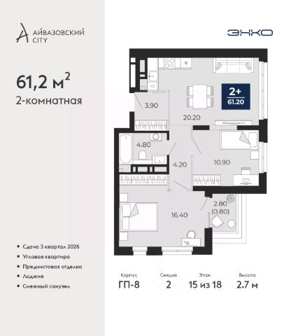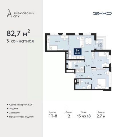 Продается 3-комн. квартира с предчистовой отделкой в ЖК "Айвазовский City" на 15 этаже. Общая площадь: 89.1 кв.м., жилая: 37.4 кв.м., площадь просторной кухни-столовой: 22.9 кв.м. Квартира угловая, очень светлая, естественная вентиляция при открытии окон. В квартире одна лоджия, два совмещенных санузла. Высота потолков 2.72 м.