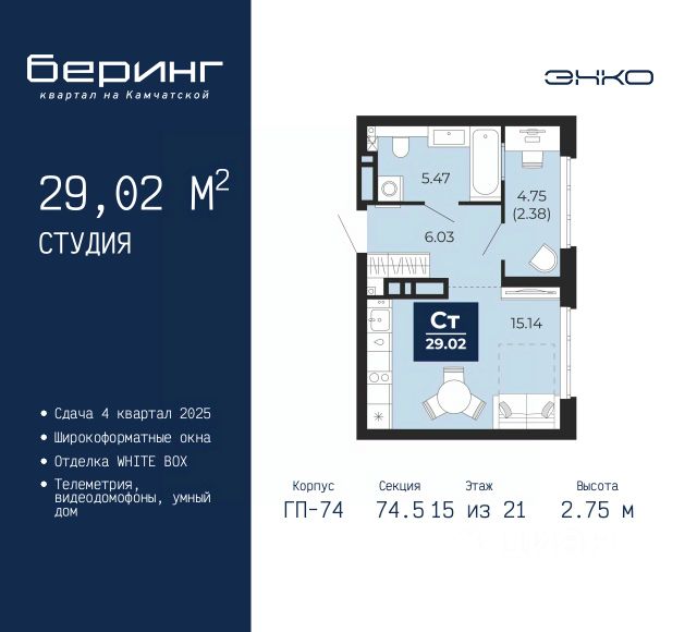 Просторная однокомнатная квартира-студия в ЖК "Беринг" на 15 этаже. Квартира без отделки, новый владелец может сделать ремонт по индивидуальному проекту. Общая площадь: 34.8 кв.м., площадь гостиной 25.22 кв.м., из которых 5 кв.м. выделено под кухонную зону. Все окна выходят на одну сторону. В квартире один балкон, один совмещенный санузел. Высота потолков 2.75 м. Дом монолитный, многоподъездный, переменной этажности, от 9 до 22 этажей. Квартира находится в 73.3-й секции высотой 16 этажей в корпусе ГП-73. На этаже 8 квартир. В подъезде 1 пассажирский и 1 грузовой лифт. Окончание строительства - 4 квартал 2025 года. Оформление сделки по договору долевого участия. Подобно знаменитому исследователю, мы чувствуем себя первооткрывателями этой локации. Хотим показать новую суть места, сформировать для вас жизненный опыт, которого ещё не было. Беринг — район зелёного цвета. Беринг — район, который откроется вам с другой стороны. Впечатлит новым уровнем комфорта и качеством жизни. Беринг — открытие на карте города. Первый квартал расположен в районе Тура, в границах улиц: Камчатская Западносибирская Энтузиастов. Вокруг уже есть всё для того, чтобы ежедневная рутина была лишь частью жизни и не доставляла дискомфорта. Школы и детские сады, магазины и аптеки, поликлиника, места для семейного отдыха, пеших и велопрогулок, и даже рыбалки. Масштабное озеленение дворов — визитная карточка ЭНКО и ваш оазис спокойствия, чтобы отвлечься от повседневности. Раскидистые деревья, кустарники, травы и цветы — осталось остановиться, вдохнуть и расслабиться, глядя на эту природную красоту. Стилистика подъездов продолжает концепцию Беринга, вдохновлённого Камчаткой: сдержанный, но при этом впечатляющий дизайн соседствует с удобством и функциональностью. #23S52d