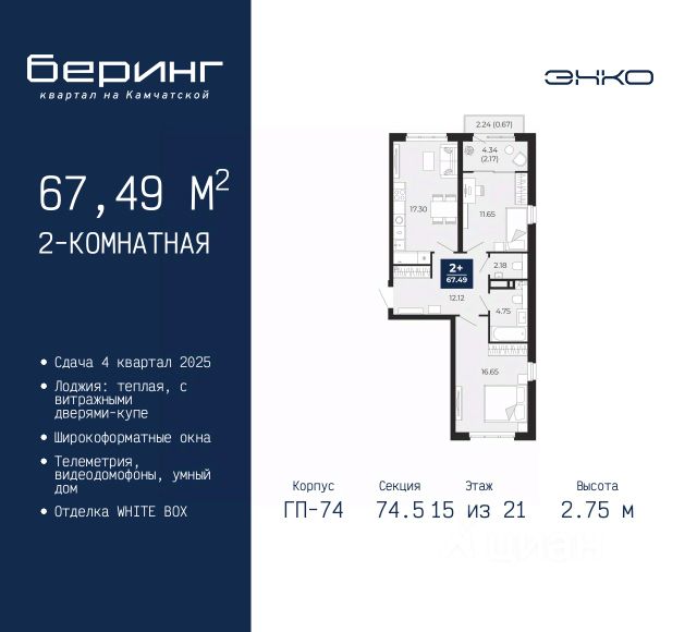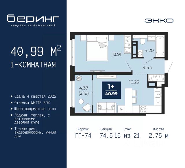 1-комн. квартира-студия от застройщика в ЖК "Беринг" на 15 этаже. Квартира без отделки, после выдачи ключей можно делать ремонт. Общая площадь: 29.02 кв.м., площадь гостиной 15.14 кв.м., из которых 5 кв.м. выделено под кухонную зону. Все окна выходят на одну сторону. В квартире один совмещенный санузел. Высота потолков 2.75 м. Дом монолитный, многоподъездный, переменной этажности, от 9 до 21 этажей. Квартира находится в 74.5-й секции высотой 21 этаж в корпусе ГП-74. На этаже 7 квартир. В подъезде 1 пассажирский и 1 грузовой лифт. Окончание строительства - 4 квартал 2025 года. Оформление сделки по договору долевого участия. Подобно знаменитому исследователю, мы чувствуем себя первооткрывателями этой локации. Хотим показать новую суть места, сформировать для вас жизненный опыт, которого ещё не было. Беринг — район зелёного цвета. Беринг — район, который откроется вам с другой стороны. Впечатлит новым уровнем комфорта и качеством жизни. Беринг — открытие на карте города. Первый квартал расположен в районе Тура, в границах улиц: Камчатская Западносибирская Энтузиастов. Вокруг уже есть всё для того, чтобы ежедневная рутина была лишь частью жизни и не доставляла дискомфорта. Школы и детские сады, магазины и аптеки, поликлиника, места для семейного отдыха, пеших и велопрогулок, и даже рыбалки. Масштабное озеленение дворов — визитная карточка ЭНКО и ваш оазис спокойствия, чтобы отвлечься от повседневности. Раскидистые деревья, кустарники, травы и цветы — осталось остановиться, вдохнуть и расслабиться, глядя на эту природную красоту. Стилистика подъездов продолжает концепцию Беринга, вдохновлённого Камчаткой: сдержанный, но при этом впечатляющий дизайн соседствует с удобством и функциональностью. #2UsWBu