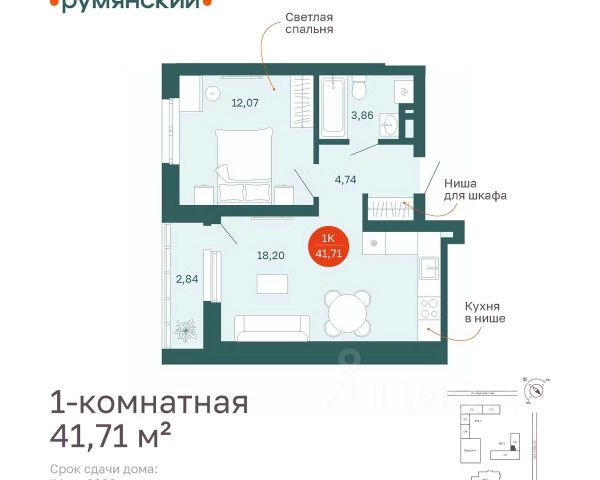 Дом монолитный, многоподъездный, переменной этажности, от 7 до 16 этажей. Квартира находится в 3-й секции высотой 7 этажей в корпусе 1. На этаже 5 квартир. В подъезде 1 грузовой лифт. Окончание строительства - 4 квартал 2026 года. Оформление сделки по договору долевого участия.