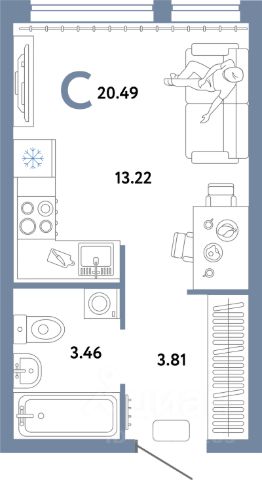 Квартира с кухней-гостиной и двумя спальнями в кварталах "На Минской". Особенности планировки: балкон, вид во двор, гардеробная, мастер-спальня, предчистовая отделка, разнесённые спальни.