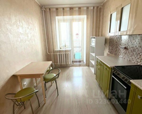 Просторная кухня правильной формы, гостиная 17, м² с окнами на две стороны и выходом на лоджию.