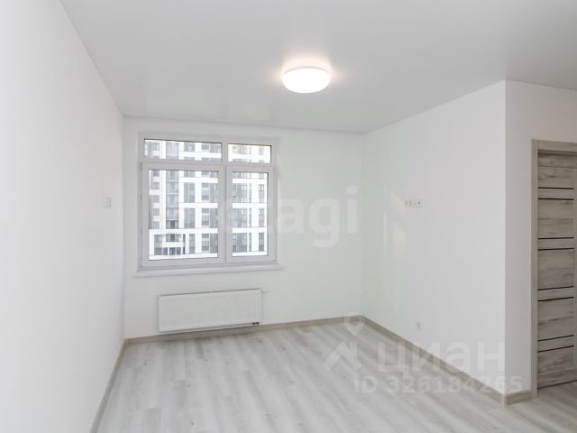 Просторная кухня правильной формы, гостиная 17, м² с окнами на две стороны и выходом на лоджию.