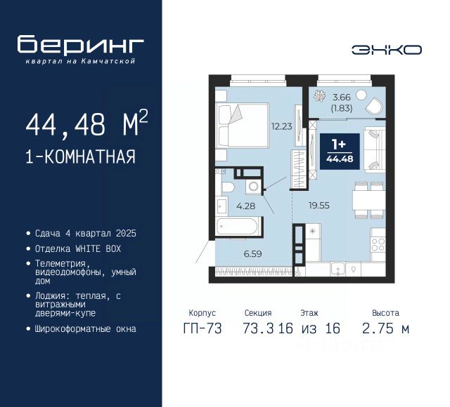 1-комн. квартира в ЖК "Беринг" на 16 этаже. Квартира без отделки, новый собственник может сделать ремонт по своему проекту. Общая площадь: 37.24 кв.м., жилая: 10.59 кв.м., площадь просторной кухни-столовой: 14.18 кв.м. Все окна выходят на одну сторону. В квартире один балкон и одна лоджия, один совмещенный санузел. Высота потолков 2.75 м. Дом монолитный, многоподъездный, переменной этажности, от 9 до 21 этажей. Квартира находится во 2-й секции высотой 17 этажей в корпусе ГП-74. На этаже 7 квартир. В подъезде 1 пассажирский и 1 грузовой лифт. Окончание строительства - 4 квартал 2025 года. Оформление сделки по договору долевого участия. Подобно знаменитому исследователю, мы чувствуем себя первооткрывателями этой локации. Хотим показать новую суть места, сформировать для вас жизненный опыт, которого ещё не было. Беринг — район зелёного цвета. Беринг — район, который откроется вам с другой стороны. Впечатлит новым уровнем комфорта и качеством жизни. Беринг — открытие на карте города. Первый квартал расположен в районе Тура, в границах улиц: Камчатская Западносибирская Энтузиастов. Вокруг уже есть всё для того, чтобы ежедневная рутина была лишь частью жизни и не доставляла дискомфорта. Школы и детские сады, магазины и аптеки, поликлиника, места для семейного отдыха, пеших и велопрогулок, и даже рыбалки. Масштабное озеленение дворов — визитная карточка ЭНКО и ваш оазис спокойствия, чтобы отвлечься от повседневности. Раскидистые деревья, кустарники, травы и цветы — осталось остановиться, вдохнуть и расслабиться, глядя на эту природную красоту. Стилистика подъездов продолжает концепцию Беринга, вдохновлённого Камчаткой: сдержанный, но при этом впечатляющий дизайн соседствует с удобством и функциональностью. #zu55WB