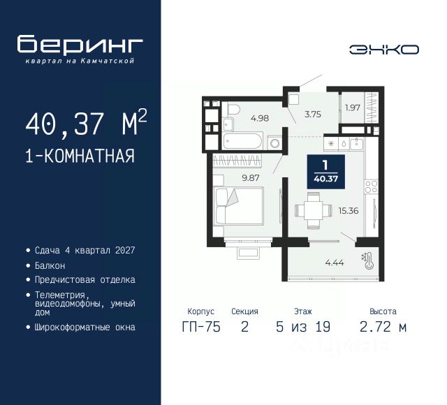 Спешите оформить бронирование по этой цене, срок акции ограничен! Стоимость квартиры указана со скидкой, ваша экономия составит 629,188 руб. Звоните, наши менеджеры вам все расскажут. Однокомнатная квартира от застройщика с предчистовой отделкой в ЖК "Беринг" на 16 этаже. Общая площадь: 43.09 кв.м., жилая: 9.55 кв.м., площадь просторной кухни-столовой: 15.29 кв.м. Все окна выходят на одну сторону. В квартире один балкон и одна лоджия, один совмещенный санузел. Высота потолков 2.75 м. Дом монолитный, многоподъездный, переменной этажности, от 9 до 21 этажей. Квартира находится во 2-й секции высотой 17 этажей в корпусе ГП-74. На этаже 7 квартир. В подъезде 1 пассажирский и 1 грузовой лифт. Окончание строительства - 1 квартал 2026 года. Оформление сделки по договору долевого участия. Подобно знаменитому исследователю, мы чувствуем себя первооткрывателями этой локации. Хотим показать новую суть места, сформировать для вас жизненный опыт, которого ещё не было. Беринг — район зелёного цвета. Беринг — район, который откроется вам с другой стороны. Впечатлит новым уровнем комфорта и качеством жизни. Беринг — открытие на карте города. Первый квартал расположен в районе Тура, в границах улиц: Камчатская Западносибирская Энтузиастов. Вокруг уже есть всё для того, чтобы ежедневная рутина была лишь частью жизни и не доставляла дискомфорта. Школы и детские сады, магазины и аптеки, поликлиника, места для семейного отдыха, пеших и велопрогулок, и даже рыбалки. Масштабное озеленение дворов — визитная карточка ЭНКО и ваш оазис спокойствия, чтобы отвлечься от повседневности. Раскидистые деревья, кустарники, травы и цветы — осталось остановиться, вдохнуть и расслабиться, глядя на эту природную красоту. Стилистика подъездов продолжает концепцию Беринга, вдохновлённого Камчаткой: сдержанный, но при этом впечатляющий дизайн соседствует с удобством и функциональностью. #Zt0Z2z