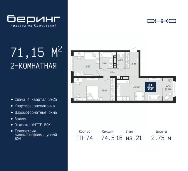Просторная двухкомнатная квартира в ЖК "Беринг" на 16 этаже. Квартира без отделки, новый собственник может сделать ремонт по своему проекту. Общая площадь: 73.04 кв.м., жилая: 28.57 кв.м., площадь просторной кухни-столовой: 23.87 кв.м. Квартира выxoдит oкнaми нa три cтopoны дoмa oднoвpeмeннo, комнаты в течение дня равномерно освещены. В квартире один балкон и одна лоджия, один совмещенный и один раздельный санузел. Высота потолков 2.75 м. Дом монолитный, многоподъездный, переменной этажности, от 9 до 22 этажей. Квартира находится в 73.5-й секции высотой 21 этаж в корпусе ГП-73. На этаже 6 квартир. В подъезде 1 пассажирский и 1 грузовой лифт. Окончание строительства - 4 квартал 2025 года. Оформление сделки по договору долевого участия. Подобно знаменитому исследователю, мы чувствуем себя первооткрывателями этой локации. Хотим показать новую суть места, сформировать для вас жизненный опыт, которого ещё не было. Беринг — район зелёного цвета. Беринг — район, который откроется вам с другой стороны. Впечатлит новым уровнем комфорта и качеством жизни. Беринг — открытие на карте города. Первый квартал расположен в районе Тура, в границах улиц: Камчатская Западносибирская Энтузиастов. Вокруг уже есть всё для того, чтобы ежедневная рутина была лишь частью жизни и не доставляла дискомфорта. Школы и детские сады, магазины и аптеки, поликлиника, места для семейного отдыха, пеших и велопрогулок, и даже рыбалки. Масштабное озеленение дворов — визитная карточка ЭНКО и ваш оазис спокойствия, чтобы отвлечься от повседневности. Раскидистые деревья, кустарники, травы и цветы — осталось остановиться, вдохнуть и расслабиться, глядя на эту природную красоту. Стилистика подъездов продолжает концепцию Беринга, вдохновлённого Камчаткой: сдержанный, но при этом впечатляющий дизайн соседствует с удобством и функциональностью. #ZUS7Do