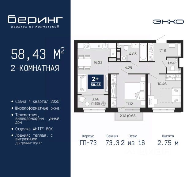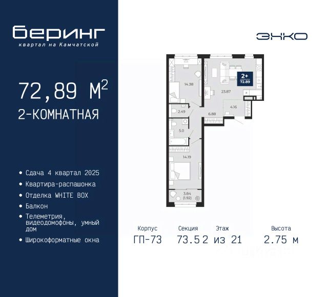 Просторная 2-комн. квартира в ЖК "Беринг" на 2 этаже. Квартира без отделки, после выдачи ключей можно делать ремонт. Общая площадь: 58.97 кв.м., жилая: 23.58 кв.м., площадь просторной кухни-столовой: 17.86 кв.м. Квартира угловая, идеально подойдет любителям тишины и панорамных видов. В квартире одна лоджия, один совмещенный и один раздельный санузел. Высота потолков 2.75 м. Дом монолитный, многоподъездный, переменной этажности, от 9 до 22 этажей. Квартира находится в 73.6-й секции высотой 9 этажей в корпусе ГП-73. На этаже 5 квартир. В подъезде 1 пассажирский и 1 грузовой лифт. Окончание строительства - 4 квартал 2025 года. Оформление сделки по договору долевого участия. Подобно знаменитому исследователю, мы чувствуем себя первооткрывателями этой локации. Хотим показать новую суть места, сформировать для вас жизненный опыт, которого ещё не было. Беринг — район зелёного цвета. Беринг — район, который откроется вам с другой стороны. Впечатлит новым уровнем комфорта и качеством жизни. Беринг — открытие на карте города. Первый квартал расположен в районе Тура, в границах улиц: Камчатская Западносибирская Энтузиастов. Вокруг уже есть всё для того, чтобы ежедневная рутина была лишь частью жизни и не доставляла дискомфорта. Школы и детские сады, магазины и аптеки, поликлиника, места для семейного отдыха, пеших и велопрогулок, и даже рыбалки. Масштабное озеленение дворов — визитная карточка ЭНКО и ваш оазис спокойствия, чтобы отвлечься от повседневности. Раскидистые деревья, кустарники, травы и цветы — осталось остановиться, вдохнуть и расслабиться, глядя на эту природную красоту. Стилистика подъездов продолжает концепцию Беринга, вдохновлённого Камчаткой: сдержанный, но при этом впечатляющий дизайн соседствует с удобством и функциональностью. #2Us7oV