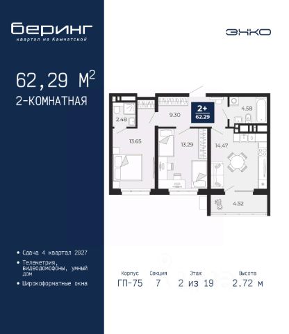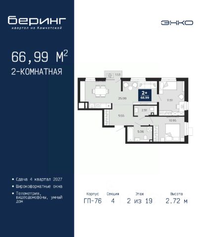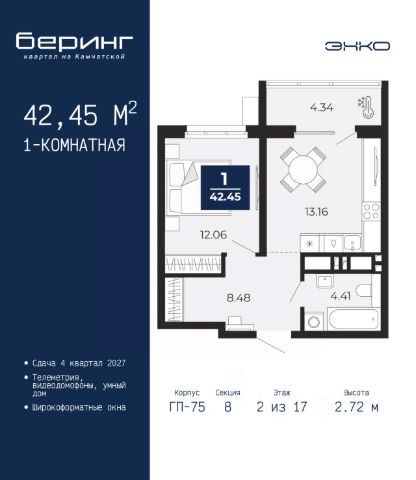 Продается 1-комн. квартира в ЖК "Беринг" на 2 этаже. Общая площадь: 46.21 кв.м. Высота потолков 2.72 м. Дом монолитный, многоподъездный, переменной этажности, от 17 до 24 этажей. Квартира находится в 1-й секции высотой 23 этажа в корпусе ГП-75. На этаже 8 квартир. В подъезде 2 пассажирских и 1 грузовой лифт. Окончание строительства - 4 квартал 2027 года. Оформление сделки по договору долевого участия. Подобно знаменитому исследователю, мы чувствуем себя первооткрывателями этой локации. Хотим показать новую суть места, сформировать для вас жизненный опыт, которого ещё не было. Беринг — район зелёного цвета. Беринг — район, который откроется вам с другой стороны. Впечатлит новым уровнем комфорта и качеством жизни. Беринг — открытие на карте города. Первый квартал расположен в районе Тура, в границах улиц: Камчатская Западносибирская Энтузиастов. Вокруг уже есть всё для того, чтобы ежедневная рутина была лишь частью жизни и не доставляла дискомфорта. Школы и детские сады, магазины и аптеки, поликлиника, места для семейного отдыха, пеших и велопрогулок, и даже рыбалки. Масштабное озеленение дворов — визитная карточка ЭНКО и ваш оазис спокойствия, чтобы отвлечься от повседневности. Раскидистые деревья, кустарники, травы и цветы — осталось остановиться, вдохнуть и расслабиться, глядя на эту природную красоту. Стилистика подъездов продолжает концепцию Беринга, вдохновлённого Камчаткой: сдержанный, но при этом впечатляющий дизайн соседствует с удобством и функциональностью. #2MdDd1
