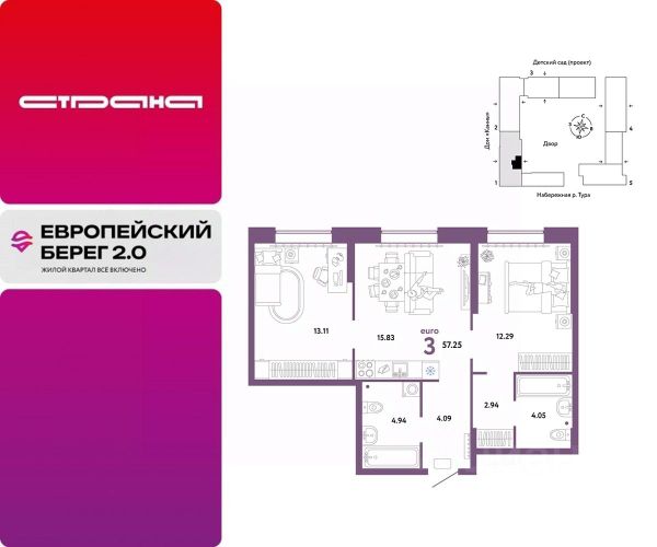 Успейте забронировать на этих условиях! Период акции ограничен! Стоимость квартиры указана со скидкой, ваша экономия составит 4,430,000 RUB. Звоните, наши менеджеры вам все расскажут! Просторная 3-комн. квартира с предчистовой отделкой в ЖК "Зарека" на 2 этаже. Общая площадь: 101.14 кв.м., жилая: 39.6 кв.м., площадь просторной кухни-гостиной: 21.9 кв.м. Квартира - распашонка, без проходных комнат, окна выходят на paзные стороны дома. В квартире два балкона, два совмещенных санузла. Терраса представляет собой роскошную зону отдыха, где вы на свой вкус можете создать атмосферу комфорта и уюта. Высота потолков 2.7 м. Дом монолитный, многоподъездный, переменной этажности, от 6 до 16 этажей. Квартира находится во 2-й секции высотой 9 этажей в корпусе 5-2. На этаже 3 квартиры. В подъезде 1 пассажирский и 1 грузовой лифт. Окончание строительства - 4 квартал 2026 года. Оформление сделки по договору долевого участия. Квартира с кухней-гостиной и тремя спальнями в жилом районе "Зарека". Особенности планировки: разнесённые спальни, свободная планировка. квартиры в нашей базе: ЗРК05.2-Ж2.2.2. Проект На планировочную структуру "Зареки" повлияла близость к автомобильному мосту Челюскинцев. Мы расположили жилые здания так, чтобы они постепенно удалялись от проезжей части. Приём напоминает лесенку: чем сильнее мост возвышается над участком застройки, тем дальше по отношению к нему стоят дома. Этот ступенчатый сдвиг позволил нам сформировать буфер между кварталами и оживлённой магистралью. Мы намерены высадить здесь высокие деревья и создать дополнительную защиту от дорожных шума и пыли. В границах нашего участка мы намерены разместить школу и два встроенных детских сада на 135 и 150 мест. Общественные пространства С севера на юг территорию будет пронизывать пешеходный бульвар. Мы мыслим это общественное пространство как главный центр притяжения. На нём будут сосредоточены основные детские игровые и спортивные зоны, места для встреч и спокойного отдыха. Он также сыграет роль мостика, ведущего к другим нашим проектам — "Европейскому кварталу" и "Дому у озера". Одна из базовых идей мастер-плана касается береговой линии. Сегодня озеленение этой территории носит стихииныи характер, а прямому доступу к Туре препятствует дамба. Мы хотим благоустроить пространства у воды и открыть их для людей. Архитекторы спроектировали систему многоярусных троп и спусков к реке, смотровые площадки и места для активного отдыха и пикников. #24c66c
