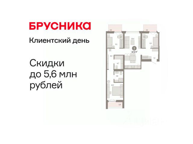 Квартира с кухней-гостиной и тремя спальнями в кварталах "На Минской". Особенности планировки: вид во двор, мастер-спальня, окна в пол, окна на две стороны, панорамное остекление, постирочная, потолки 3 м и выше, предчистовая отделка, разнесённые спальни, терраса.