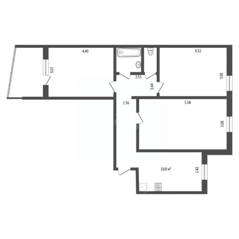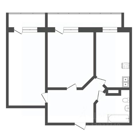 Планировка квартиры включает кухню, соединенную с гостиной, две спальни, одна из которых может быть детской комнатой, а также прихожую с гардеробной, раздельный санузел и лоджию (на кухне).