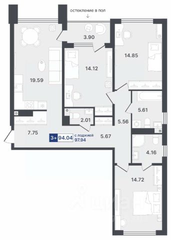 изолированную комнату площадью 15,3 кв.м. - простор для отдыха.