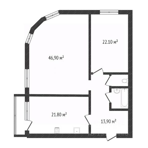 Планировка квартиры включает в себя две изолированные комнаты: спальня 10,7 кв.м, детская комната 12,1 кв.м, просторная кухня гостиная площадью 24,8 кв.м. с выходом на лоджию 4 кв.м, ванная 4,5 кв.м, санузел 2 кв.м и большая прихожая 6,8 кв.м.