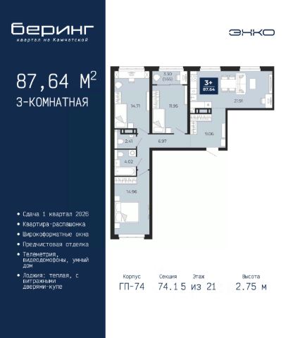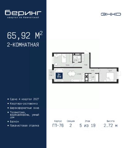 2-комн. квартира с предчистовой отделкой в ЖК "Беринг" на 5 этаже. Общая площадь: 67.49 кв.м., жилая: 28.3 кв.м., площадь просторной кухни-столовой: 17.3 кв.м. Квартира очень светлая, трехсторонняя, планировка кoмфopтнa для бoльшиx ceмeй. В квартире один балкон и одна лоджия, один совмещенный и один раздельный санузел. Высота потолков 2.75 м. Дом монолитный, многоподъездный, переменной этажности, от 9 до 21 этажей. Квартира находится в 74.5-й секции высотой 21 этаж в корпусе ГП-74. На этаже 7 квартир. В подъезде 1 пассажирский и 1 грузовой лифт. Окончание строительства - 1 квартал 2026 года. Оформление сделки по договору долевого участия. Подобно знаменитому исследователю, мы чувствуем себя первооткрывателями этой локации. Хотим показать новую суть места, сформировать для вас жизненный опыт, которого ещё не было. Беринг — район зелёного цвета. Беринг — район, который откроется вам с другой стороны. Впечатлит новым уровнем комфорта и качеством жизни. Беринг — открытие на карте города. Первый квартал расположен в районе Тура, в границах улиц: Камчатская Западносибирская Энтузиастов. Вокруг уже есть всё для того, чтобы ежедневная рутина была лишь частью жизни и не доставляла дискомфорта. Школы и детские сады, магазины и аптеки, поликлиника, места для семейного отдыха, пеших и велопрогулок, и даже рыбалки. Масштабное озеленение дворов — визитная карточка ЭНКО и ваш оазис спокойствия, чтобы отвлечься от повседневности. Раскидистые деревья, кустарники, травы и цветы — осталось остановиться, вдохнуть и расслабиться, глядя на эту природную красоту. Стилистика подъездов продолжает концепцию Беринга, вдохновлённого Камчаткой: сдержанный, но при этом впечатляющий дизайн соседствует с удобством и функциональностью. #zUstb6