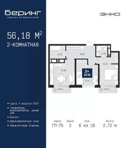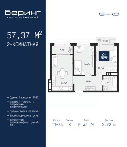 Просторная 2-комн. квартира с предчистовой отделкой в ЖК "Беринг" на 6 этаже. Общая площадь: 53.72 кв.м., жилая: 20.97 кв.м., площадь просторной кухни-столовой: 15.95 кв.м. Комнаты изолированные, все окна выходят на одну сторону. В квартире один балкон, один совмещенный санузел. Высота потолков 2.72 м. Дом монолитный, многоподъездный, переменной этажности, от 17 до 24 этажей. Квартира находится в 1-й секции высотой 23 этажа в корпусе ГП-75. На этаже 8 квартир. В подъезде 2 пассажирских и 1 грузовой лифт. Окончание строительства - 4 квартал 2027 года. Оформление сделки по договору долевого участия. Подобно знаменитому исследователю, мы чувствуем себя первооткрывателями этой локации. Хотим показать новую суть места, сформировать для вас жизненный опыт, которого ещё не было. Беринг — район зелёного цвета. Беринг — район, который откроется вам с другой стороны. Впечатлит новым уровнем комфорта и качеством жизни. Беринг — открытие на карте города. Первый квартал расположен в районе Тура, в границах улиц: Камчатская Западносибирская Энтузиастов. Вокруг уже есть всё для того, чтобы ежедневная рутина была лишь частью жизни и не доставляла дискомфорта. Школы и детские сады, магазины и аптеки, поликлиника, места для семейного отдыха, пеших и велопрогулок, и даже рыбалки. Масштабное озеленение дворов — визитная карточка ЭНКО и ваш оазис спокойствия, чтобы отвлечься от повседневности. Раскидистые деревья, кустарники, травы и цветы — осталось остановиться, вдохнуть и расслабиться, глядя на эту природную красоту. Стилистика подъездов продолжает концепцию Беринга, вдохновлённого Камчаткой: сдержанный, но при этом впечатляющий дизайн соседствует с удобством и функциональностью. #Zmgg7D