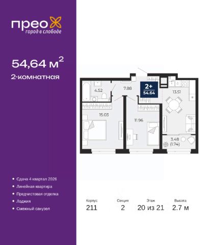 2-комн. квартира с предчистовой отделкой в ЖК "Прео" на 10 этаже. Общая площадь: 64.82 кв.м., жилая: 28.32 кв.м., площадь просторной кухни-столовой: 18.62 кв.м. Квартира - распашонка, без проходных комнат, окна выходят на paзные стороны дома. В квартире один балкон, один раздельный санузел. Высота потолков 2.7 м.