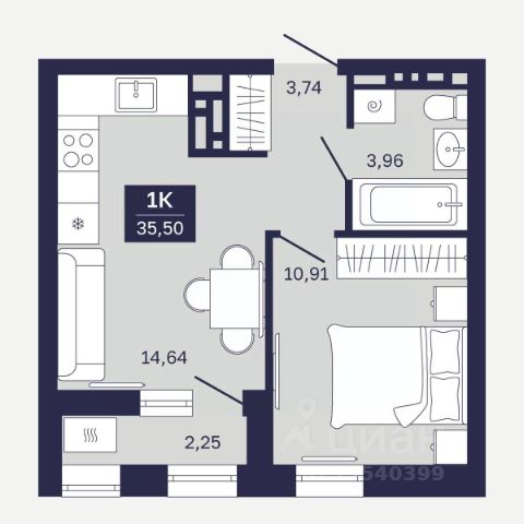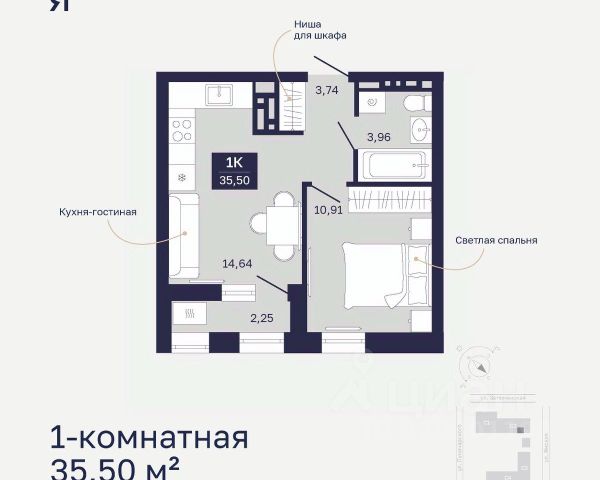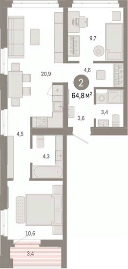 1-комн. студия с предчистовой отделкой в ЖК "Республики 205" на 6 этаже. Общая площадь: 19.82 кв.м., площадь гостиной 10.1 кв.м., из которых 5 кв.м. выделено под кухонную зону. Все окна выходят на одну сторону. В квартире один балкон, один совмещенный санузел. Высота потолков 2.6 м.
