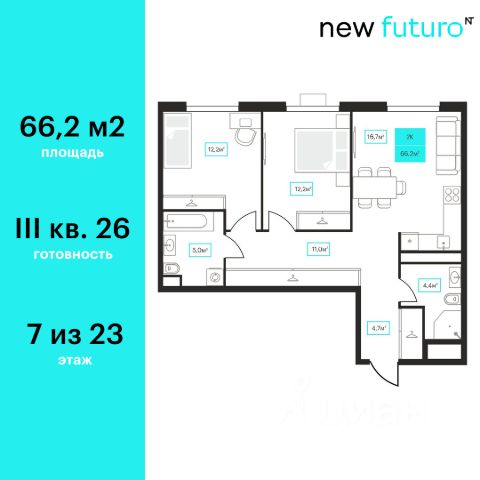 Продаётся 2-комнатная квартира в строящемся доме (Дом 6к1), срок сдачи: III-кв. 2026, общей площадью 66.2 кв.м., на 7 этаже. Новый жилой комплекс "Futuro" от застройщика "newton" расположен в г. Тюмень на Ставропольской улице.
