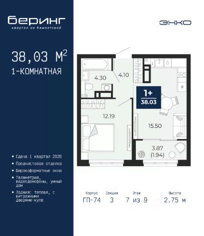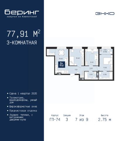 Продается двухкомнатная квартира с предчистовой отделкой в ЖК "Беринг" на 7 этаже. Общая площадь: 66.65 кв.м., жилая: 27.48 кв.м., площадь просторной кухни-столовой: 24.37 кв.м. Угловая квартира, идеально подойдет любителям тишины и панорамных видов. В квартире одна лоджия, один совмещенный и один раздельный санузел. Высота потолков 2.75 м. Дом монолитный, многоподъездный, переменной этажности, от 9 до 21 этажей. Квартира находится в 74.5-й секции высотой 21 этаж в корпусе ГП-74. На этаже 7 квартир. В подъезде 1 пассажирский и 1 грузовой лифт. Окончание строительства - 1 квартал 2026 года. Оформление сделки по договору долевого участия. Подобно знаменитому исследователю, мы чувствуем себя первооткрывателями этой локации. Хотим показать новую суть места, сформировать для вас жизненный опыт, которого ещё не было. Беринг — район зелёного цвета. Беринг — район, который откроется вам с другой стороны. Впечатлит новым уровнем комфорта и качеством жизни. Беринг — открытие на карте города. Первый квартал расположен в районе Тура, в границах улиц: Камчатская Западносибирская Энтузиастов. Вокруг уже есть всё для того, чтобы ежедневная рутина была лишь частью жизни и не доставляла дискомфорта. Школы и детские сады, магазины и аптеки, поликлиника, места для семейного отдыха, пеших и велопрогулок, и даже рыбалки. Масштабное озеленение дворов — визитная карточка ЭНКО и ваш оазис спокойствия, чтобы отвлечься от повседневности. Раскидистые деревья, кустарники, травы и цветы — осталось остановиться, вдохнуть и расслабиться, глядя на эту природную красоту. Стилистика подъездов продолжает концепцию Беринга, вдохновлённого Камчаткой: сдержанный, но при этом впечатляющий дизайн соседствует с удобством и функциональностью. #zU57mc