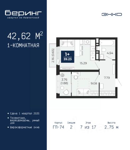 Успейте забронировать, пока действует скидка, период акции ограничен! Стоимость квартиры указана со скидкой, ваша экономия составит 312,875 руб. По всем вопросам обращайтесь в офис продаж, мы вам все подробно расскажем. Однокомнатная квартира с предчистовой отделкой в ЖК "Беринг" на 7 этаже. Общая площадь: 39.25 кв.м., жилая: 11.42 кв.м., площадь просторной кухни-столовой: 15.49 кв.м. Все окна выходят на одну сторону. В квартире одна лоджия, один совмещенный санузел. Высота потолков 2.75 м. Дом монолитный, многоподъездный, переменной этажности, от 9 до 21 этажей. Квартира находится во 2-й секции высотой 17 этажей в корпусе ГП-74. На этаже 7 квартир. В подъезде 1 пассажирский и 1 грузовой лифт. Окончание строительства - 1 квартал 2026 года. Оформление сделки по договору долевого участия. Подобно знаменитому исследователю, мы чувствуем себя первооткрывателями этой локации. Хотим показать новую суть места, сформировать для вас жизненный опыт, которого ещё не было. Беринг — район зелёного цвета. Беринг — район, который откроется вам с другой стороны. Впечатлит новым уровнем комфорта и качеством жизни. Беринг — открытие на карте города. Первый квартал расположен в районе Тура, в границах улиц: Камчатская Западносибирская Энтузиастов. Вокруг уже есть всё для того, чтобы ежедневная рутина была лишь частью жизни и не доставляла дискомфорта. Школы и детские сады, магазины и аптеки, поликлиника, места для семейного отдыха, пеших и велопрогулок, и даже рыбалки. Масштабное озеленение дворов — визитная карточка ЭНКО и ваш оазис спокойствия, чтобы отвлечься от повседневности. Раскидистые деревья, кустарники, травы и цветы — осталось остановиться, вдохнуть и расслабиться, глядя на эту природную красоту. Стилистика подъездов продолжает концепцию Беринга, вдохновлённого Камчаткой: сдержанный, но при этом впечатляющий дизайн соседствует с удобством и функциональностью. #Z6DElc