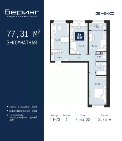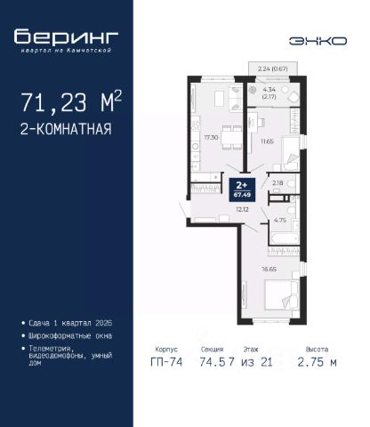 Спешите забронировать на этих условиях, срок акции ограничен! Стоимость квартиры указана со скидкой, ваша экономия составит 328,383 руб. Информация по телефону, наши менеджеры вам все расскажут. Однокомнатная квартира от застройщика в ЖК "Беринг" на 7 этаже. Общая площадь: 47.55 кв.м. Высота потолков 2.75 м. Дом монолитный, многоподъездный, переменной этажности, от 9 до 21 этажей. Квартира находится в 74.5-й секции высотой 21 этаж в корпусе ГП-74. На этаже 7 квартир. В подъезде 1 пассажирский и 1 грузовой лифт. Окончание строительства - 1 квартал 2026 года. Оформление сделки по договору долевого участия. Подобно знаменитому исследователю, мы чувствуем себя первооткрывателями этой локации. Хотим показать новую суть места, сформировать для вас жизненный опыт, которого ещё не было. Беринг — район зелёного цвета. Беринг — район, который откроется вам с другой стороны. Впечатлит новым уровнем комфорта и качеством жизни. Беринг — открытие на карте города. Первый квартал расположен в районе Тура, в границах улиц: Камчатская Западносибирская Энтузиастов. Вокруг уже есть всё для того, чтобы ежедневная рутина была лишь частью жизни и не доставляла дискомфорта. Школы и детские сады, магазины и аптеки, поликлиника, места для семейного отдыха, пеших и велопрогулок, и даже рыбалки. Масштабное озеленение дворов — визитная карточка ЭНКО и ваш оазис спокойствия, чтобы отвлечься от повседневности. Раскидистые деревья, кустарники, травы и цветы — осталось остановиться, вдохнуть и расслабиться, глядя на эту природную красоту. Стилистика подъездов продолжает концепцию Беринга, вдохновлённого Камчаткой: сдержанный, но при этом впечатляющий дизайн соседствует с удобством и функциональностью. #zmDe7t