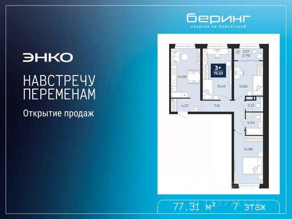 Спешите забронировать по акционной цене, период предложения ограничен! Стоимость квартиры указана со скидкой, ваша экономия составит 988,225 руб. По всем вопросам звоните в офис продаж, наши менеджеры вам все расскажут. Просторная 3-комн. квартира с предчистовой отделкой в ЖК "Беринг" на 7 этаже. Общая площадь: 79.74 кв.м., жилая: 34.78 кв.м., площадь просторной кухни-столовой: 19.45 кв.м. Комнаты изолированные, все окна выходят на одну сторону. В квартире одна лоджия, два совмещенных санузла. Высота потолков 2.75 м. Дом монолитный, многоподъездный, переменной этажности, от 9 до 21 этажей. Квартира находится в 3-й секции высотой 9 этажей в корпусе ГП-74. На этаже 7 квартир. В подъезде 1 грузовой лифт. На сегодняшний день строительство завершено, дом сдан в 1 квартале 2026 года. Оформление сделки по договору купли-продажи. Подобно знаменитому исследователю, мы чувствуем себя первооткрывателями этой локации. Хотим показать новую суть места, сформировать для вас жизненный опыт, которого ещё не было. Беринг — район зелёного цвета. Беринг — район, который откроется вам с другой стороны. Впечатлит новым уровнем комфорта и качеством жизни. Беринг — открытие на карте города. Первый квартал расположен в районе Тура, в границах улиц: Камчатская Западносибирская Энтузиастов. Вокруг уже есть всё для того, чтобы ежедневная рутина была лишь частью жизни и не доставляла дискомфорта. Школы и детские сады, магазины и аптеки, поликлиника, места для семейного отдыха, пеших и велопрогулок, и даже рыбалки. Масштабное озеленение дворов — визитная карточка ЭНКО и ваш оазис спокойствия, чтобы отвлечься от повседневности. Раскидистые деревья, кустарники, травы и цветы — осталось остановиться, вдохнуть и расслабиться, глядя на эту природную красоту. Стилистика подъездов продолжает концепцию Беринга, вдохновлённого Камчаткой: сдержанный, но при этом впечатляющий дизайн соседствует с удобством и функциональностью.