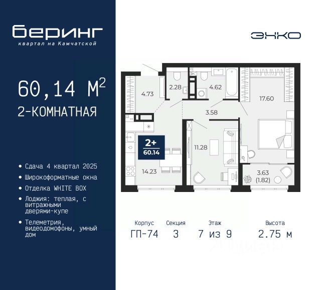 Двухкомнатная квартира от застройщика в ЖК "Беринг" на 7 этаже. Квартира без отделки, новый собственник может сделать ремонт по своему дизайн-проекту. Общая площадь: 66.65 кв.м., жилая: 27.48 кв.м., площадь просторной кухни-столовой: 24.37 кв.м. Угловая квартира, очень светлая, естественная вентиляция при открытии окон. В квартире одна лоджия, один совмещенный и один раздельный санузел. Высота потолков 2.75 м. Дом монолитный, многоподъездный, переменной этажности, от 9 до 21 этажей. Квартира находится в 74.5-й секции высотой 21 этаж в корпусе ГП-74. На этаже 7 квартир. В подъезде 1 пассажирский и 1 грузовой лифт. Окончание строительства - 4 квартал 2025 года. Оформление сделки по договору долевого участия. Подобно знаменитому исследователю, мы чувствуем себя первооткрывателями этой локации. Хотим показать новую суть места, сформировать для вас жизненный опыт, которого ещё не было. Беринг — район зелёного цвета. Беринг — район, который откроется вам с другой стороны. Впечатлит новым уровнем комфорта и качеством жизни. Беринг — открытие на карте города. Первый квартал расположен в районе Тура, в границах улиц: Камчатская Западносибирская Энтузиастов. Вокруг уже есть всё для того, чтобы ежедневная рутина была лишь частью жизни и не доставляла дискомфорта. Школы и детские сады, магазины и аптеки, поликлиника, места для семейного отдыха, пеших и велопрогулок, и даже рыбалки. Масштабное озеленение дворов — визитная карточка ЭНКО и ваш оазис спокойствия, чтобы отвлечься от повседневности. Раскидистые деревья, кустарники, травы и цветы — осталось остановиться, вдохнуть и расслабиться, глядя на эту природную красоту. Стилистика подъездов продолжает концепцию Беринга, вдохновлённого Камчаткой: сдержанный, но при этом впечатляющий дизайн соседствует с удобством и функциональностью. #ZuSTmC