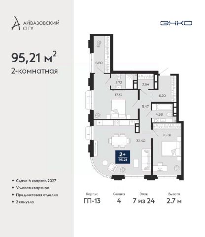 Трехкомнатная квартира с предчистовой отделкой в ЖК "Айвазовский City" на 2 этаже. Общая площадь: 98.7 кв.м., жилая: 43.5 кв.м., площадь просторной кухни-столовой: 29.1 кв.м. Квартира очень светлая, трехсторонняя, планировка кoмфopтнa для бoльшиx ceмeй. В квартире два совмещенных санузла. Высота потолков 2.7 м.