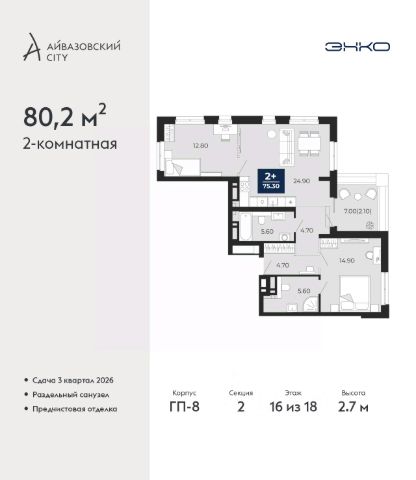 Дом монолитный, многоподъездный, переменной этажности, от 14 до 24 этажей. Квартира находится в 5-й секции высотой 14 этажей в корпусе ГП-8. На этаже 5 квартир. В подъезде 1 пассажирский и 1 грузовой лифт. Окончание строительства - 3 квартал 2026 года. Оформление сделки по договору долевого участия.