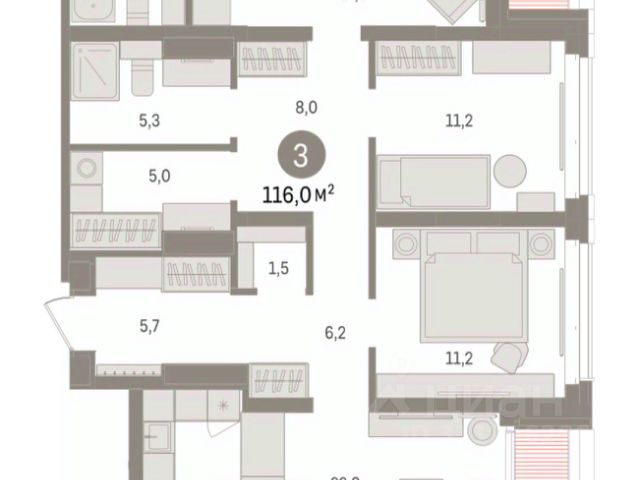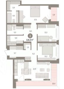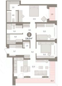 3-комн. квартира от застройщика с предчистовой отделкой в Кварталы "На Минской" на 8 этаже. Общая площадь: 116 кв.м., жилая: 39.7 кв.м., площадь просторной кухни-гостиной: 22.9 кв.м. Угловая квартира, очень светлая, естественная вентиляция при открытии окон. В квартире один балкон и одна лоджия, два совмещенных санузла. Терраса представляет собой роскошную зону отдыха для проведение вечеров в кругу семьи и друзей или организация вечеринок. Высота потолков 2.7 м. Дом монолитный, многоподъездный, переменной этажности, от 7 до 16 этажей. Квартира находится в 1-й секции высотой 16 этажей в корпусе 1. На этаже 8 квартир. В подъезде 2 пассажирских лифта. Окончание строительства - 4 квартал 2026 года. Оформление сделки по договору долевого участия. Квартира с кухней-гостиной и тремя спальнями в кварталах "На Минской". Особенности планировки: гардеробная, лоджия, мастер-спальня, панорамное остекление, постирочная, предчистовая отделка. квартиры в нашей базе: МНС01-Ж1.8.1. В сердце города Кварталы "На Минской" находятся в самом центре. За десять минут можно дойти до площади 400-летия Тюмени и Большого Драматического театра, Тюменского индустриального и медицинского университетов, спортивного комплекса "Строймаш", ТРЦ "Гудвин" и "Премьер", Тюменского технопарка. Поблизости много детских садов, школ и поликлиник. Пространство разного опыта Создавая кварталы "На Минской" мы вдохновлялись Хакскими дворами в Берлине и улицей Давида Агмашенебели в Тбилиси. И первые и вторая — яркие разнообразные пространства, сформированные прогрессивными архитекторами и притягивающие городских интеллектуалов. Престижная недвижимость здесь соседствует с барами, ресторанами, креативными кластерами и бюро, дизайнерскими лавками. Полезные улицы Кварталы "На Минской" свяжет сеть променадов, автомобильных проездов и велодорожек. Уличный фронт проекта мы сформируем с помощью аллейной посадки деревьев. Они создадут тень для ресторанов и кафе на первых этажах, визуально отделят проезжую и пешеходную части, снизят объём пыли и уровень шума. Мы реализуем проект в районе с развитой базовой инфраструктурой. И поэтому тщательно подошли к программированию коммерции, посчитав, что её основная задача — "закрывать" более высокие потребности жителей. Здесь может появиться пекарня с вкусными круассанами, турагентство на случай, если захочется перезимовать в Сочи, массажный кабинет, ресторан, когда надоело есть дома и многое другое. #Z55Sz9
