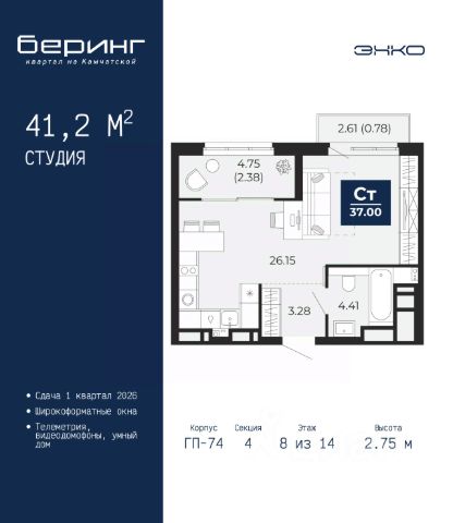 Торопитесь оформить бронирование на этих условиях, срок предложения ограничен! Стоимость квартиры указана со скидкой, ваша экономия составит 313,470 руб. По всем вопросам обращайтесь в офис продаж, наши менеджеры вам все расскажут. Просторная 1-комн. квартира в ЖК "Беринг" на 8 этаже. Общая площадь: 39 кв.м. Высота потолков 2.75 м. Дом монолитный, многоподъездный, переменной этажности, от 9 до 21 этажей. Квартира находится в 3-й секции высотой 9 этажей в корпусе ГП-74. На этаже 7 квартир. В подъезде 1 грузовой лифт. Окончание строительства - 1 квартал 2026 года. Оформление сделки по договору долевого участия. Подобно знаменитому исследователю, мы чувствуем себя первооткрывателями этой локации. Хотим показать новую суть места, сформировать для вас жизненный опыт, которого ещё не было. Беринг — район зелёного цвета. Беринг — район, который откроется вам с другой стороны. Впечатлит новым уровнем комфорта и качеством жизни. Беринг — открытие на карте города. Первый квартал расположен в районе Тура, в границах улиц: Камчатская Западносибирская Энтузиастов. Вокруг уже есть всё для того, чтобы ежедневная рутина была лишь частью жизни и не доставляла дискомфорта. Школы и детские сады, магазины и аптеки, поликлиника, места для семейного отдыха, пеших и велопрогулок, и даже рыбалки. Масштабное озеленение дворов — визитная карточка ЭНКО и ваш оазис спокойствия, чтобы отвлечься от повседневности. Раскидистые деревья, кустарники, травы и цветы — осталось остановиться, вдохнуть и расслабиться, глядя на эту природную красоту. Стилистика подъездов продолжает концепцию Беринга, вдохновлённого Камчаткой: сдержанный, но при этом впечатляющий дизайн соседствует с удобством и функциональностью. #Zmde2l