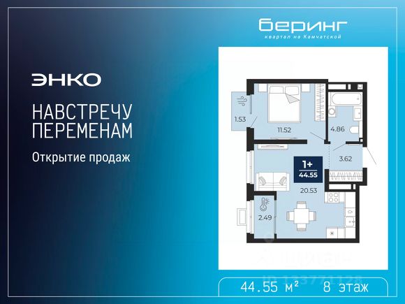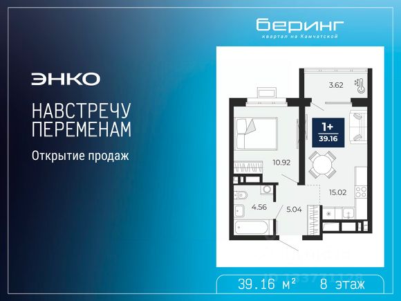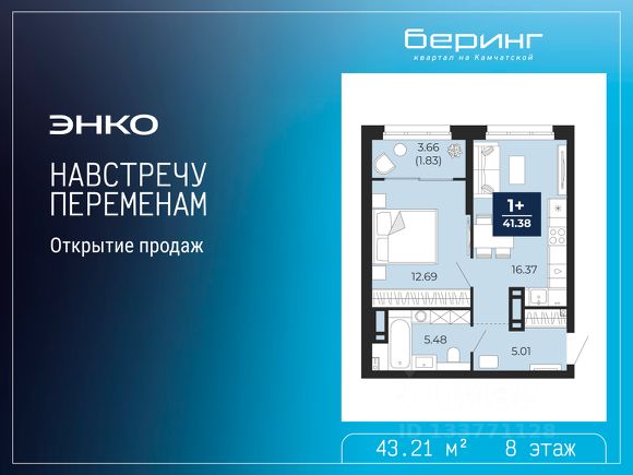 Торопитесь забронировать, пока действует скидка, предложение ограничено! Стоимость квартиры указана со скидкой, ваша экономия составит 575,739 руб. По всем вопросам обращайтесь в офис продаж, мы вам все подробно расскажем. 1-комн. квартира-студия от застройщика с предчистовой отделкой в ЖК "Беринг" на 8 этаже. Общая площадь: 38.48 кв.м., площадь гостиной 25.22 кв.м., из которых 10 кв.м. выделено под кухонную зону. Все окна выходят на одну сторону. В квартире один балкон и одна лоджия, один совмещенный санузел. Высота потолков 2.75 м. Дом монолитный, многоподъездный, переменной этажности, от 6 до 22 этажей. Квартира находится в 3-й секции высотой 16 этажей в корпусе ГП-73. На этаже 8 квартир. В подъезде 1 пассажирский и 1 грузовой лифт. Строительство завершено, дом сдан в 1 квартале 2026 года. Оформление сделки по договору купли-продажи. Подобно знаменитому исследователю, мы чувствуем себя первооткрывателями этой локации. Хотим показать новую суть места, сформировать для вас жизненный опыт, которого ещё не было. Беринг — район зелёного цвета. Беринг — район, который откроется вам с другой стороны. Впечатлит новым уровнем комфорта и качеством жизни. Беринг — открытие на карте города. Первый квартал расположен в районе Тура, в границах улиц: Камчатская Западносибирская Энтузиастов. Вокруг уже есть всё для того, чтобы ежедневная рутина была лишь частью жизни и не доставляла дискомфорта. Школы и детские сады, магазины и аптеки, поликлиника, места для семейного отдыха, пеших и велопрогулок, и даже рыбалки. Масштабное озеленение дворов — визитная карточка ЭНКО и ваш оазис спокойствия, чтобы отвлечься от повседневности. Раскидистые деревья, кустарники, травы и цветы — осталось остановиться, вдохнуть и расслабиться, глядя на эту природную красоту. Стилистика подъездов продолжает концепцию Беринга, вдохновлённого Камчаткой: сдержанный, но при этом впечатляющий дизайн соседствует с удобством и функциональностью.